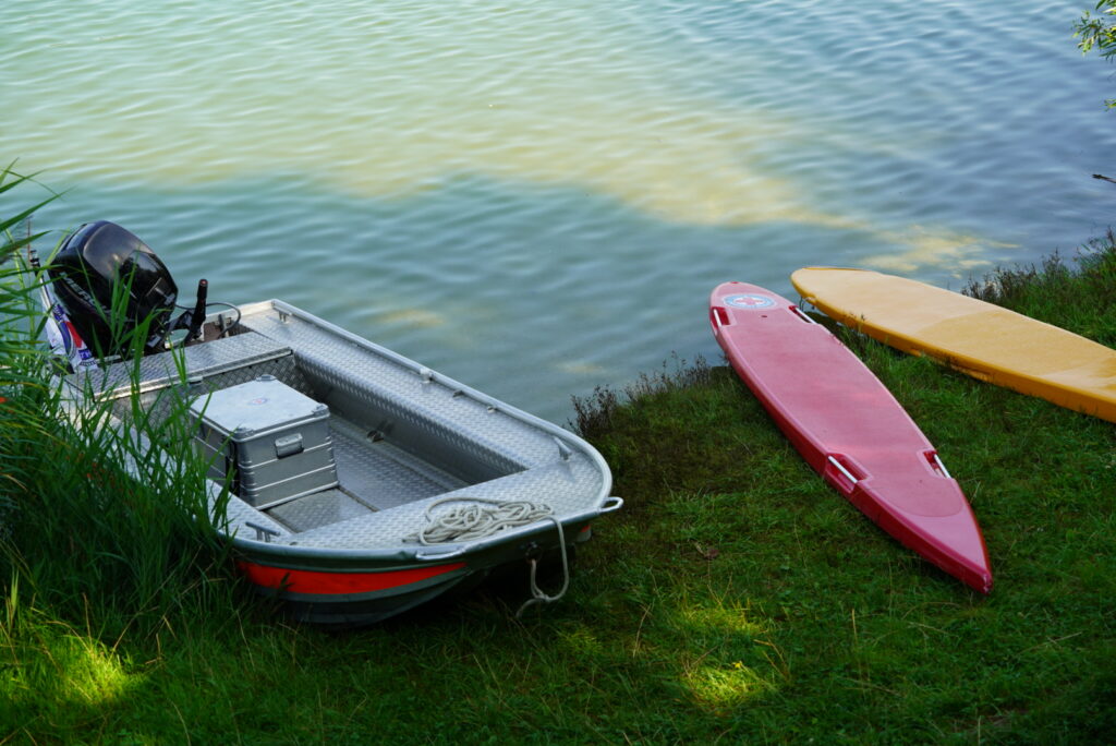 Eine unserer Wachstationen befindet sich am Radersdorfer Baggersee in der Nähe von Paar bei Aichach. Der See hat eine riesige Liegefläche samt Spielplatz und Sandstrand. Als Alternative zum reinen Baden befindet sich neben dem anliegenden Campingplatz ein Minigolffeld und gleich in der Nähe können Trettboote ausgeliehen werden. Damit wir als Wasserwacht dem großen Einsatzgebiet Herr werden können, sind wir mit einem Motorboot und mehreren Rettungsbrettern ausgestattet.